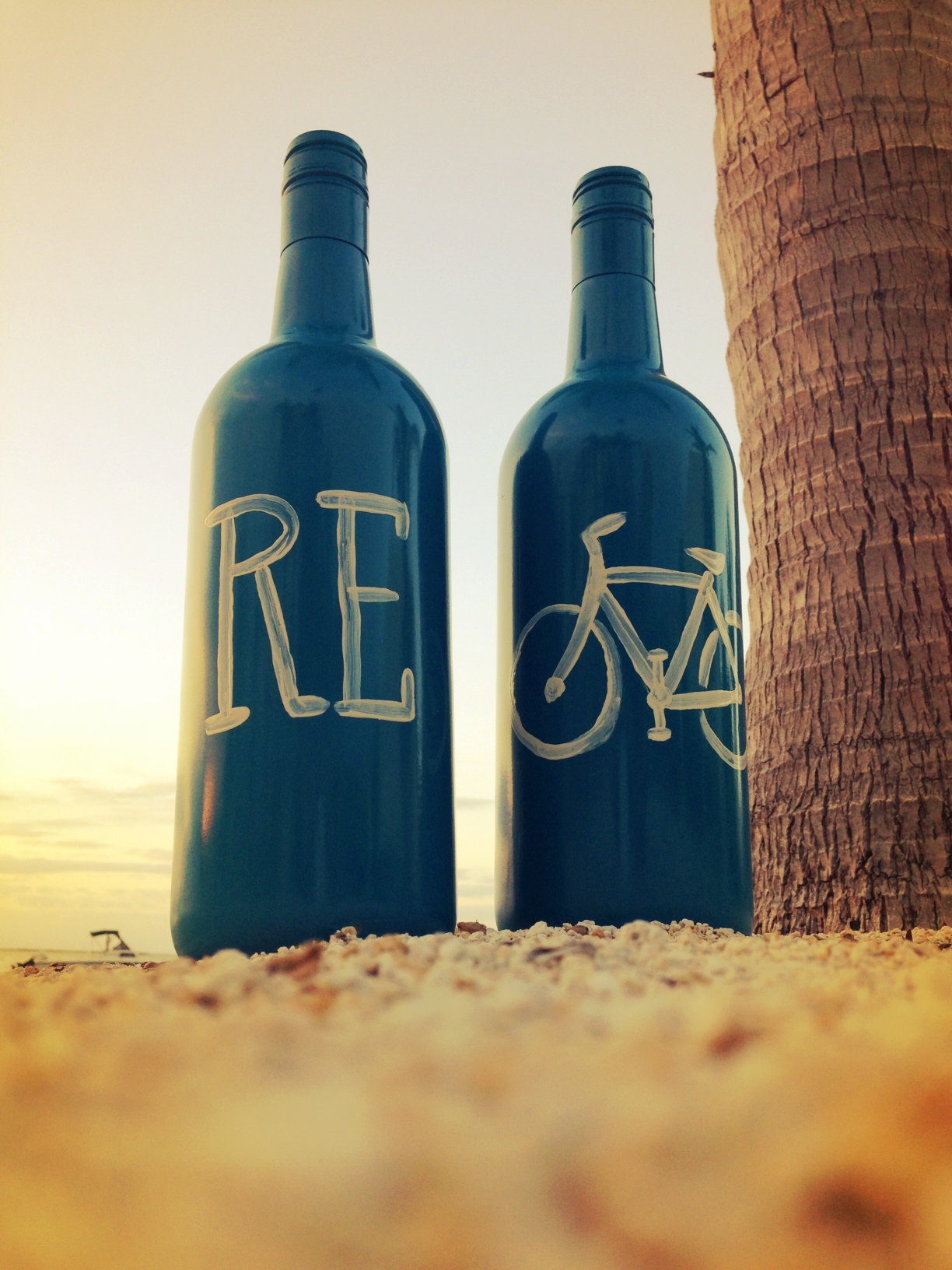 Set of recycled Teal bottles with hand painted Re-cycle emblem. (18" tall)